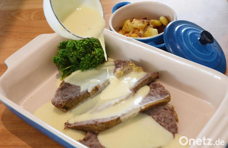 Je nach Größe den Tafelspitz bei kleiner Hitze rund drei bis vier Stunden ziehen lassen. "Bitte nicht kochen", rät OWZ-Küchenchef Michael Schiffer. Nach zwei Stunden das Salz zur Suppe geben. Für die Sauce die Butter auslassen, mit drei Esslöffel Mehl bestäuben und mit drei bis vier Kellen Tafelspitz-Brühe ablöschen. Dabei ständig umrühren. Den Meerrettich zugeben und die Sauce glattrühren. Zirka fünf Minuten auf kleiner Flamme köcheln lassen. Die Sauce mit Salz und Zucker abschmecken und weitere fünf Minuten köcheln. Dabei ständig umrühren. Eventuell noch etwas Brühe zugeben, damit die Sauce nicht zu dick wird. Zum Schluss die Sahne zugeben und nicht mehr umrühren. Für den Kartoffelschmarrn die Kartoffeln mit der Schale kochen und abkühlen lassen. Die Pellkartoffeln abziehen, stampfen, salzen und mit etwas Mehl zu einer bröseligen Masse verarbeiten. In Butterschmalz unter häufigem Wenden knusprig braten. "Eine Rezeptidee eines Freundes, dem Erfinder der Küchenclowns in Bonn." (dt)