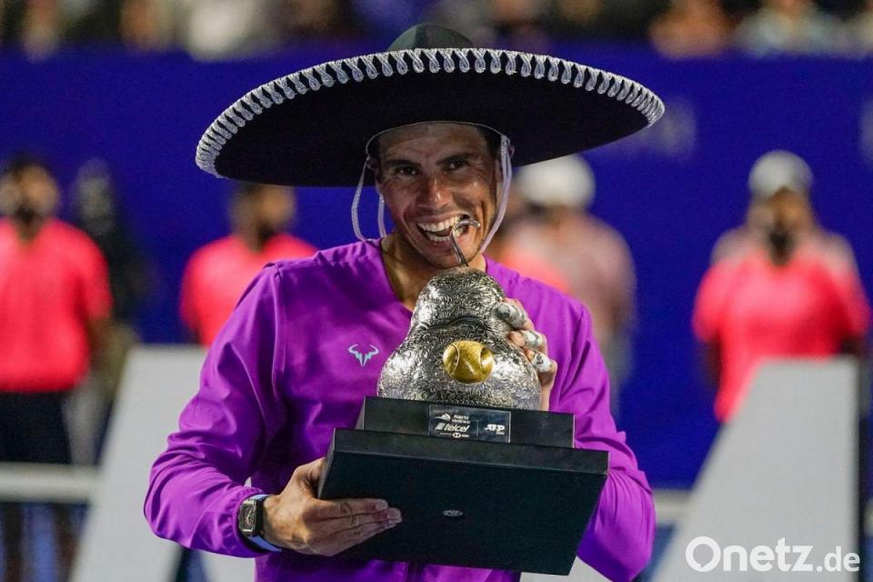 Ist der Pokal auch echt? Tennis-Superstar Rafael Nadal beißt nach seinem Finalsieg gegen den Briten Cameron Norrie beim Turnier in Acapulco in die Trophäe.