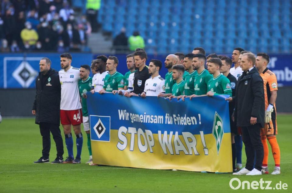 Die Spieler vom Hamburger SV und SV Werder Bremen stehen vor dem Spiel während einer Schweigeminute für die Ukraine zusammen, und halten ein Banner mit der Aufschrift "Wir gemeinsam für Frieden! stop war!"