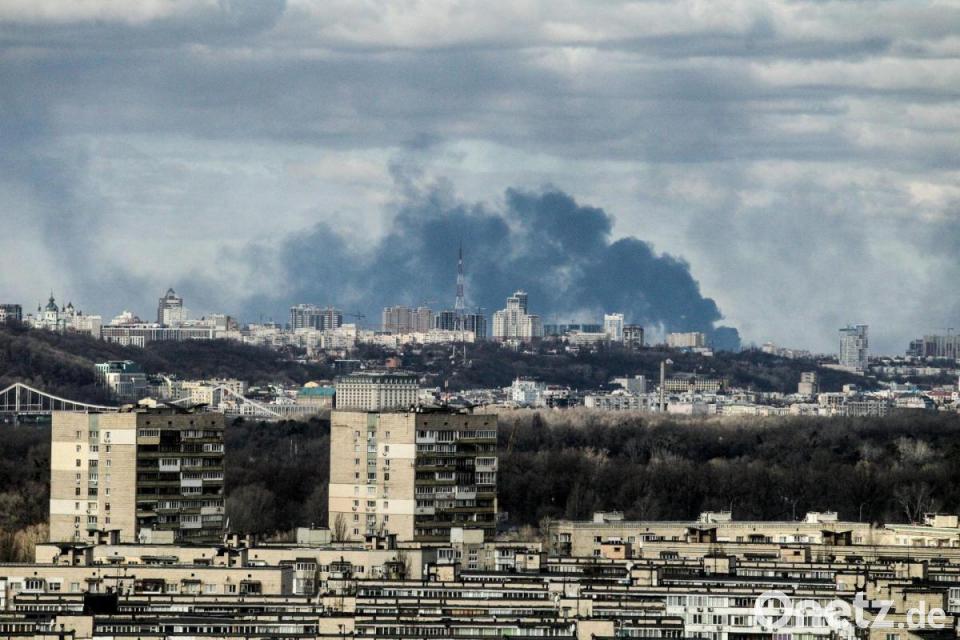 Rauch steigt über dem Teil der ukrainischen Hauptstadt Kiew auf. Die Angriffe der russischen Truppen dauern an.