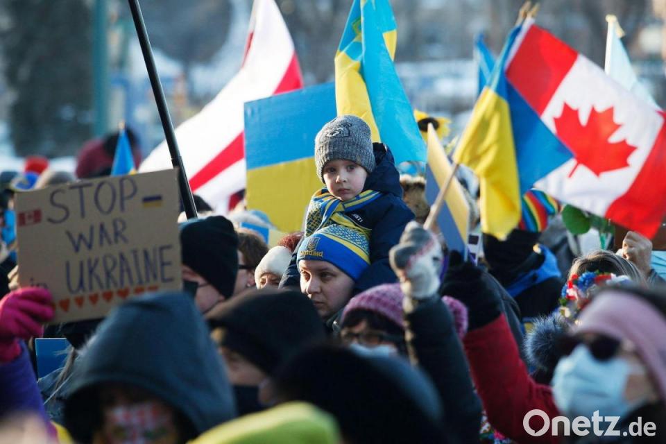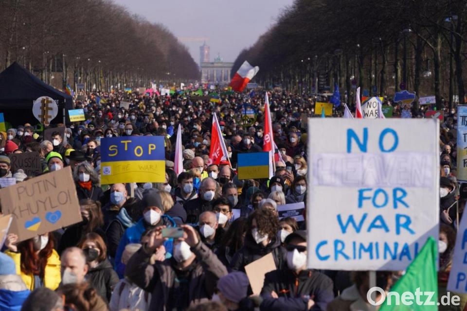 Demonstranten in Berlin fordern mit Schildern und Plakaten Russland auf den Krieg zu stoppen.