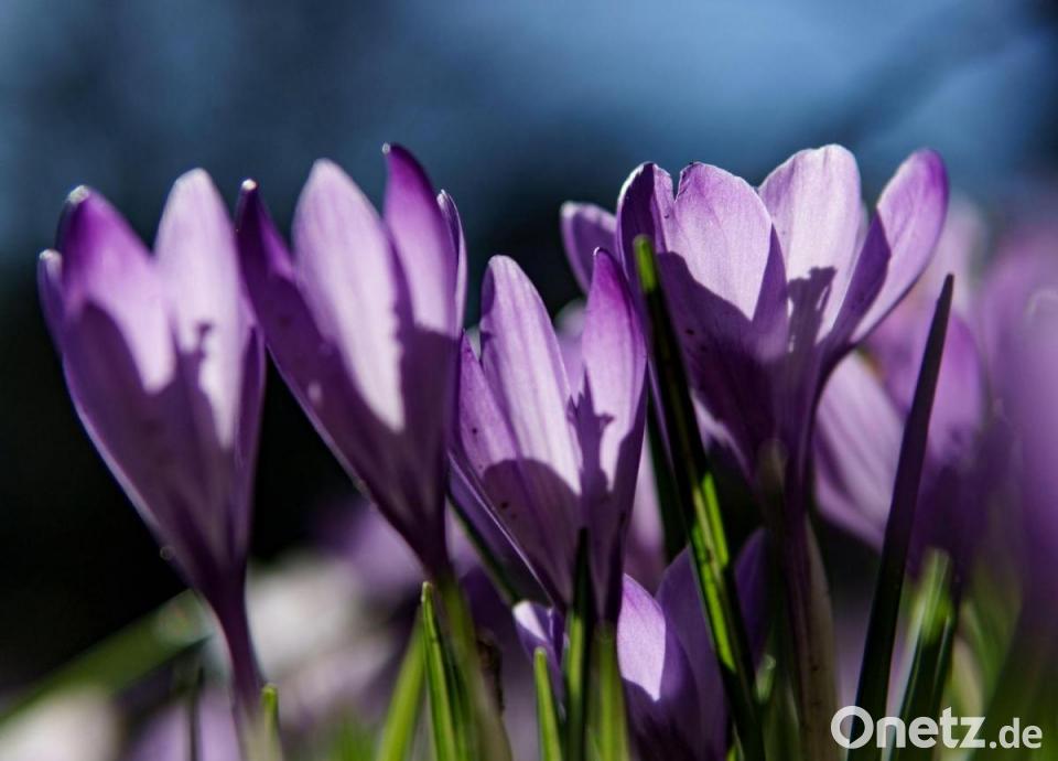 Krokusse blühen im Sonnenschein in einem Park im schleswig-holsteinischen Eckernförde.