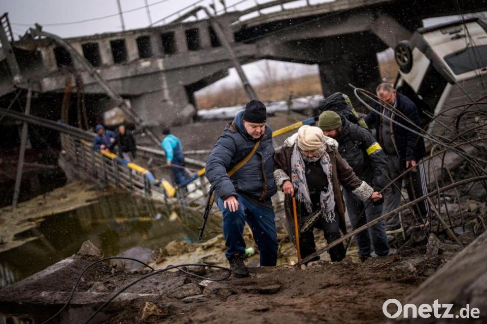Örtliche Milizionäre helfen einer alten Frau über eine zerstörte Brücke am Stadtrand von Kiew.