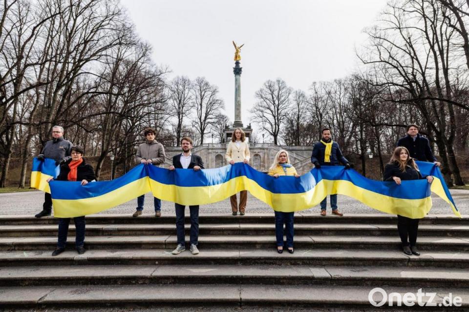Freie Wähler, Linke, Grüne, CSU, FDP und SPD: Mehrere bayerische Politiker tragen während einer überparteilichen Aktion für die Ukraine ein langes Banner in den Farben der ukrainischen Landesflagge.