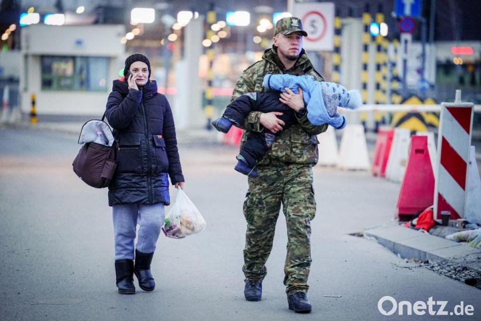 Ein polnischer Soldat trägt ein Kind über den ukrainsch-polnischen Grenzübergang in Medyka.