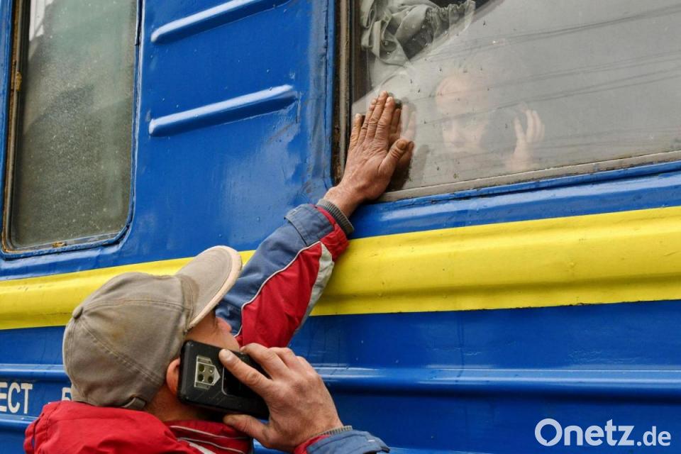 Ein Mann verabschiedet sich von einem Kind, das auf die Abfahrt in Richtung Westukraine wartet.
