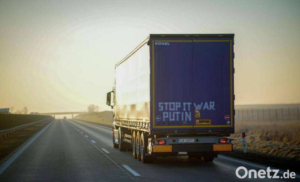 Ein Lastwagen mit der Aufschrift „Stop it war Putin“ auf seinem Anhänger fährt am frühen Morgen über die A4 in Polen Richtung Breslau.