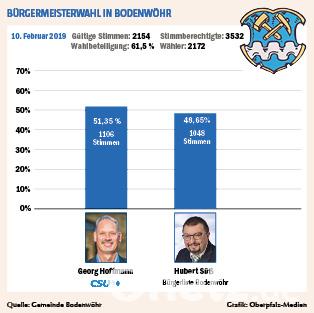 Der CSU-Mann setzte sich in der Stichwahl gegen Hubert Süß von der Bürgerliste Bodenwöhr (BLB) durch. Hoffmann erhielt 51,35 Prozent aller Stimmen, Süß 48,65 Prozent. Die Wahlbeteiligung liegt bei 61,5 Prozent.