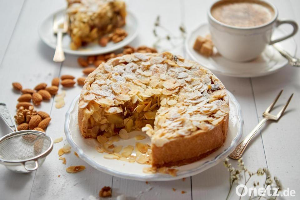 Mehl, Pudding-Pulver, Salz, Butter, Zucker, Eier und Bittermandelöl mit dem Knethaken zu einem glatten Teig verarbeiten. Einen Springform-Boden mit Backpapier belegen. Zwei Drittel des Teigs auf Springform-Größe mit 2 Zentimetern Rand ausrollen und in die Form geben. Dann für mindestens 45 Minuten in den Kühlschrank stellen. Äpfel schälen, Kernhaus entfernen und in kleine Scheiben schneiden. Auf dem Teigboden verteilen. Den restlichen Mürbteig kreisrund ausrollen und auf die Äpfel legen.