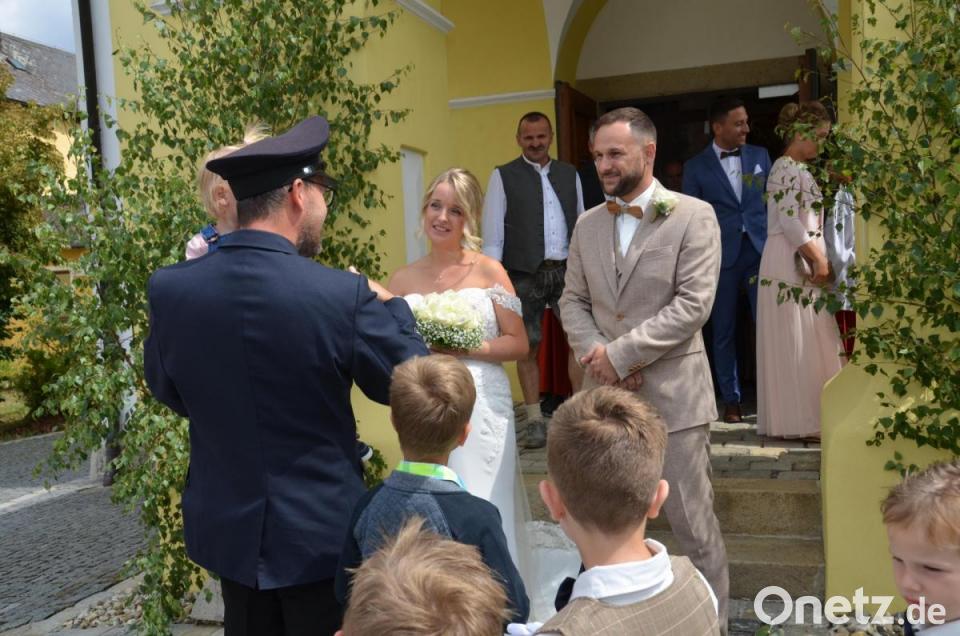 Nach der Trauung empfingen Fußballer des TSV Pleystein das strahlende Brautpaar, denn wenn Not am Mann ist, steht Patrick in der dritten Mannschaft der Pleysteiner mit dem Trikot parat. Glückwünsche überbrachte auch die Abordnung der Freiwilligen Feuerwehr mit Andreas Ogarek und Martin Vater, die ihrem langjährigen Mitglied die besten Glückwünsche mit auf den Weg gaben. Zur Feier ging es im Anschluss in den Kastanienhof nach Hinterbrünst.