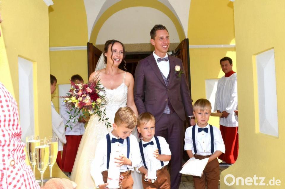 Nach der Übergabe der vier Brautburschen Lukas, Simon und zwei Mal Hannes in die Obhut ihrer Eltern folgte für das Hochzeitspaar ein wahrer Spaliermarathon. Es war der Vorstand des TSV Pleystein mit ihrer Fußballmannschaft gekommen. Dann die Schar der Frauenfußballerinnen des SV Altenstadt bei Vohenstrauß. Nicht fehlen durften die Bayernfans aus Pleystein und die Feuerwehr Böhmischbruck. Mitten drin auch Pleysteins Bürgermeister Rainer Rewitzer mit seiner ganzen Familie, der das Paar standesamtlich getraut hatte. Vor der gemeinsamen Ausfahrt zur Hochzeitsfeier nach Trausnitz gab es für die Steuerfachangestellte und den Elektrotechniker noch ein besonderes Zuckerl: Die Pleysteiner Prinzengarde gratulierte mit einem Showtanz durch ihren Nachwuchs.