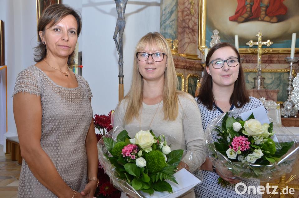 (dob) Pfarrgemeinderatssprecherin Luise Feneis nutzte das Patrozinium in der Pfarrkirche „Mariä Himmelfahrt“, um zwei Frauen für ihr Engagement zu danken. Seit elf Jahren ist Daniela Bock (Mitte) unverzichtbar im Kirchenchor. Ohne sie wäre die Gemeinschaft längst auseinandergebrochen. Beherzt übernahm die junge Frau vor elf Jahren den Taktstock und leitet seither gefühlvoll den Chor. Seit zehn Jahren sitzt Julia Duschinger (rechts) an der Orgel und verschönt die Gottesdienste, obwohl sie mittlerweile in Weiden lebt. „Ihr seid beide eine ganz große Stütze für unsere Pfarrgemeinde“, lobte Feneis und überreichte Blumen.