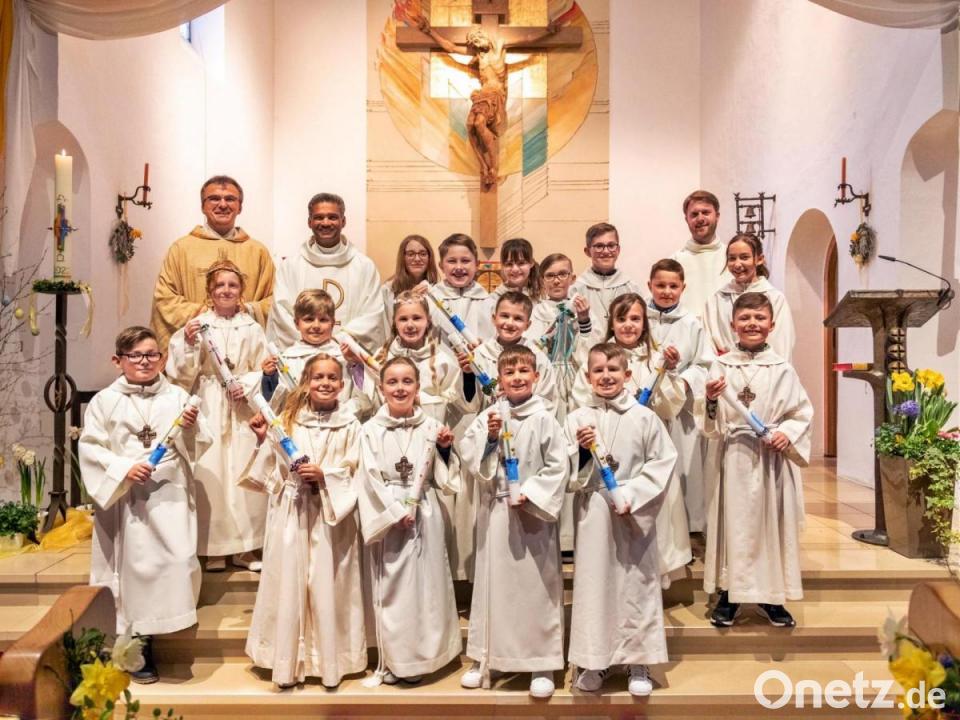 "Jesus ist mein Licht und mein Leben. In der heiligen Kommunion schenkt er sich mir ganz", war das Thema des Gottesdienstes zur Erstkommunion. Fünf Buben und neun Mädchen hatten sich mit Pater Joy und Pastoralreferent Maximilian Pravida auf den großen Tag vorbereitet.