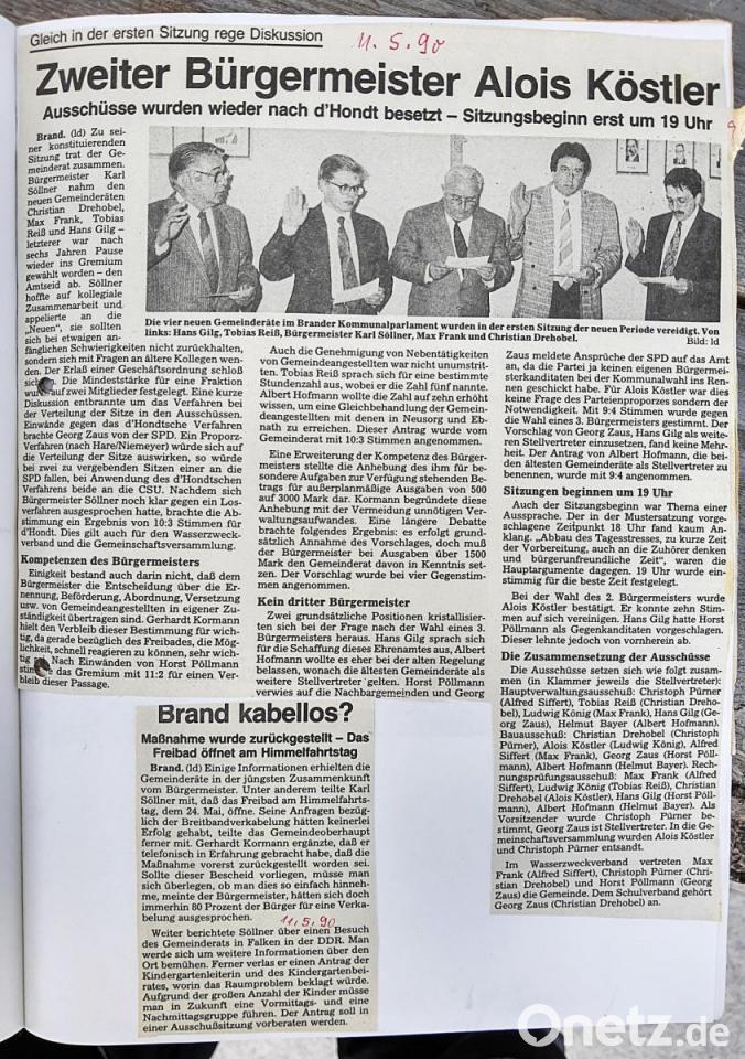 Auch in Brand stand die konstituierende Sitzung des neuen Gemeinderats an: "Mein erster Termin und gleich so was!" Bertram Nold hatte nach eigenen Angaben keine Ahnung, welcher Umfang gefordert war, wie man das alles pressemäßig verarbeitet. "Anfänger! Blutiger Anfänger! Unerfahren und auch unsicher! Deshalb ließ ich meinen fertigen Bericht Bürgermeister Karl Söllner lesen mit der Bitte um sachliche Prüfung." Die Antwort: "Passt! Schön geworden."