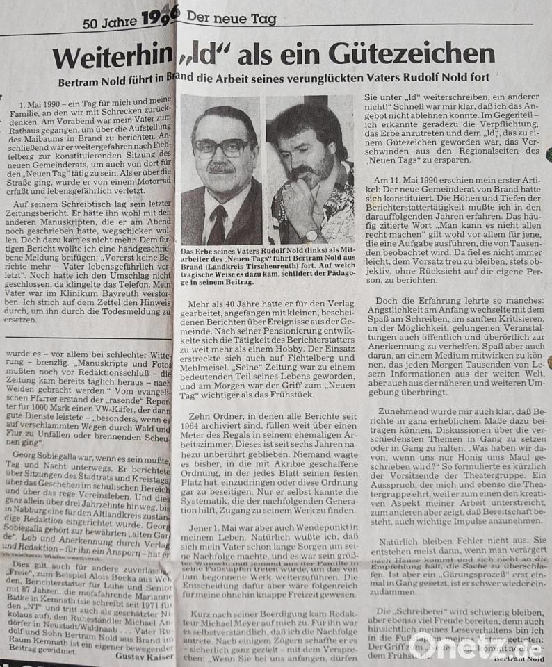 Bertram Nolds Vater schrieb den ersten Bericht 1956 und war 34 Jahre beim "Neuen Tag". "Für mich jährt sich die Presse-Arbeit im Mai zum 30. Mal. Am 11.5.1990 erschien mein erster Bericht. Das Archivieren der Berichte hat sich mittlerweile auch erledigt. Am Ende eines Jahres gibt es die Berichte aller Redaktionen auf einem USB-Stick."