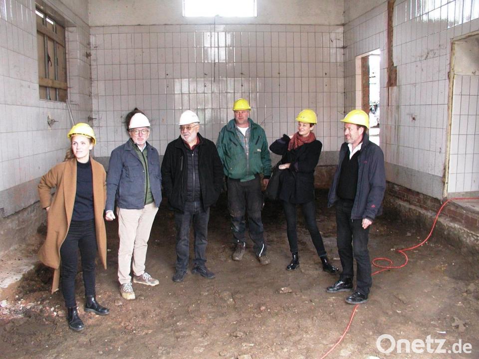 Ihr wurde das Aufsägen der westlichen Öffnung übertragen, wo einmal ein Café mit Terrasse entstehen soll. Es bedurfte aufwendiger Vorarbeiten, um die Maschinen anzubringen. Schließlich drangen riesige Sägeblätter, aus der Ferne gesteuert, ins Ziegelmauerwerk ein um mit perfekt gesetzten Schnitten die Öffnung herauszuschneiden. Der Rest geschah per Hand und Stück für Stück wurde der freigesägte Teil der Mauer abgetragen. Nun ist ein Blick in den Innenraum möglich, wo die alten Eisenträger, alte Kabel und auch die weißen Fliesen des früheren Schlachthauses sichtbar sind. Zeit für Bauleiter Karl Landgraf, sich mit den Architektinnen des Büros von Peter Haimerl, Judith Kinzl und Anna Firak zu treffen und das weitere Vorgehen zu erörtern.