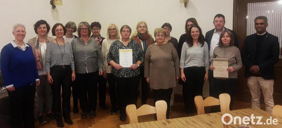 Regionalkantor Stephan Merkes – bis vor einigen Jahren Leiter des Chores – gratulierte. Er überreichte Urkunden für 10-jährige Mitgliedschaft an Martina Bayer und Claudia Bayer, für 20 Jahre an Susanne Plannerer, Martina Scherm, Maria Schultes und Brigitte Sticht. Schließlich durften sechs Sängerinnen je eine vom Bischof unterschriebene Urkunde für 25 Jahre entgegennehmen: Lisa Glowka, Andrea Graf, Angelika Hoffmann, Claudia Sticht, Elisabeth Doleschal, Sabine Keller und Regina Reindl. Auch Pater Joy dankte herzlich für viele schöne Auftritte.