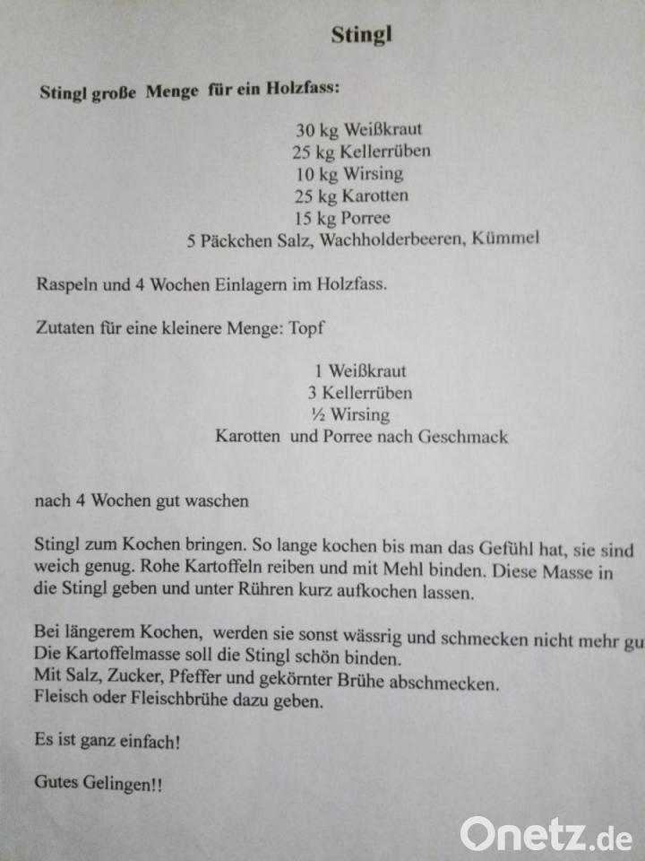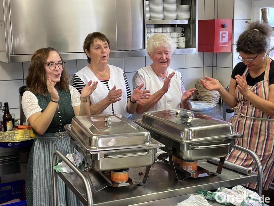 Nach dem Weißwurstfrühstück bei Bürgermeister Bernhard Schindler und dessen Frau Christina zogen die Kirwamoidla und -burschen zum Kindergarten. Die Kirwaleute sangen und feierten hier im Garten mit den Kleinsten. Danach ging es weiter in den Mehrzwecksaal. Dort bietet seit vielen Jahren die Theatergruppe das heiß begehrte "Stingl-Essen" an. Zu Stoßzeiten kamen die "Kniadlweiba" in der Küche ganz schön ins Schwitzen. "Stingl" bestehen aus Kellerrüben, Weißkraut, Wirsing, Lauch und Karotten, die bereits Mitte September geputzt, gekuttert, gewürzt und eingelegt werden. Am Kirchweihsonntag werden sie aus dem Fass geholt und ordentlich gewässert, am Montag von den "Kniadlweibern" mit rohen Kartoffeln und Mehl gebunden. Dazu gibt es Kammfleisch und Schweinebauch mit Kniadla aus handgeriebenen Erdäpfeln. Seit über 25 Jahren gehören sie zum Kirwamontag, heuer wurden rund 250 Portionen ausgegeben.