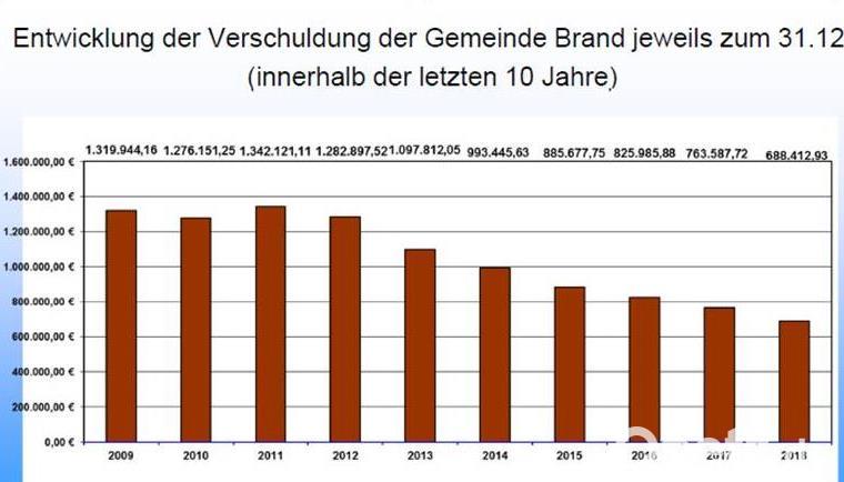 Die Straßenbeleuchtung wurde auf LED-Lampen umgestellt. Für diese beispielhafte Maßnahme habe die Kommune als Anerkennung ein Zertifikat der Nationalen Klimaschutzbehörde im Bundesumweltministerium erhalten. Im Mehrzwecksaal wurden Leinwand, Beamer, Lichtanlage und Bühnenvorhang neu angeschafft. Beim Weiher in Fuhrmannsreuthsei das Beweissicherungsgutachten mit einem Ergänzungsgutachten endgültig abgeschlossen worden. Seitens der Gemeinde Brand erfolge nun die Aufforderung zur Mängelbeseitigung. Der Breitbandausbau gehe zügig voran: Ab Mai 2019 können rund 130 Haushalte Anschlüsse mit Geschwindigkeiten von bis 50 MBit/s buchen. Von rund 260 000 Euro entfallen auf die Gemeinde rund 26 000 Euro.