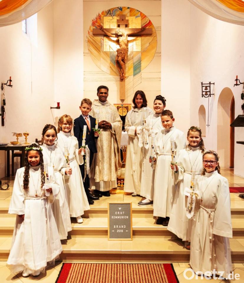 Nach einer intensiven Vorbereitung durch Gemeindereferentin Gabriele Sieder, Pater Joy und Eltern durften acht Kinder Pfarrei Herz Jesu Brand am Weißen Sonntag erstmals zum Tisch des Herrn gehen. Mit ihren Eltern trafen sich die Erstkommunikanten am Rathaus, wo sie von Pater Joy und den Ministranten abgeholt und zur Kirche geleitet wurden. Hier wurden sie mit Orgelmusik durch Walter Reischer empfangen. Musikalisch umrahmt wurde der Gottesdienst von der Gruppe Inshallah unter der Leitung von Beate Zehrer, die weitere Instrumentalisten mit Schlagzeug, Querflöten, Geige und Gitarren zur Begleitung der Lieder mitgebracht hatte. Der feierliche Tag schloss mit einer Dankandacht am Abend in der Pfarrkirche.
