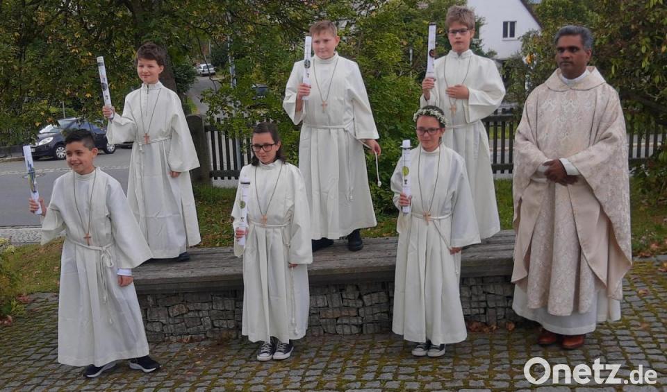 Bei der Erstkommunionfeier war die Zahl der Gäste am Sonntag wegen der Ansteckungsgefahr zahlenmäßig beschränkt worden. Nur Kommunionkinder, Eltern und nahe Verwandte durften ins Gotteshaus. Nicht alle, die dabei sein wollten, bekamen einen Platz. Mit Pater Joy, dem neuen Pastoralreferenten Maximilian Pravida und den Eltern erlebten die elf Kinder dennoch eine sehr würdevolle und beeindruckende Feier. "Jesus ist unsere Mitte" lautete das Motto, für das die ehemalige Gemeindereferentin Bettina Rögner, unter der die Vorbereitungen begonnen hatten, das Rad gewählt hatte.