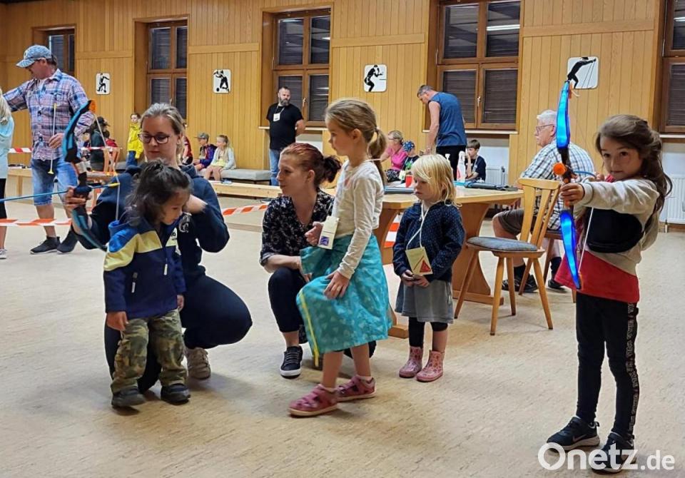 Jeder Teilnehmer erhielt ein Umhängeband mit einem farbigen Kärtchen – jeweils grün, rot oder blau markiert – auf das der Name geschrieben wurde. Gemeinderat Robert Seitz zeigte auf einem abgesperrten Feld des Fußballplatzes das Bogenschießen mit einem echten großen Sportbogen. Dazu gab es Informationen zur Sportart. In der Sporthalle hatten die Gemeinderäte Sven Kuhbandner und Chris Pürner drei Schießbahnen mit Absperrbändern und Ruhemöglichkeiten vorbereitet. Für die Kleinsten gab es eine Ecke, in der sie mit Kinderbögen auf eine Pyramide aus Schaumstofftonnen schießen konnten. Immer wieder unterstützten die Mütter beim Spannen des Bogens und Schießen. Während des Trainings der Größeren, die schon etwas stärkere Bögen benutzten, nahm wegen der großen Anzahl der Kinder Jugendbeauftragte Maria König als Betreuerin teil. Im Lauf des Übens wurden sogar manche „Zehner“ erzielt. Zur Stärkung hatte die FWG Pommes, Chicken Nuggets und Getränke vorbereitet.