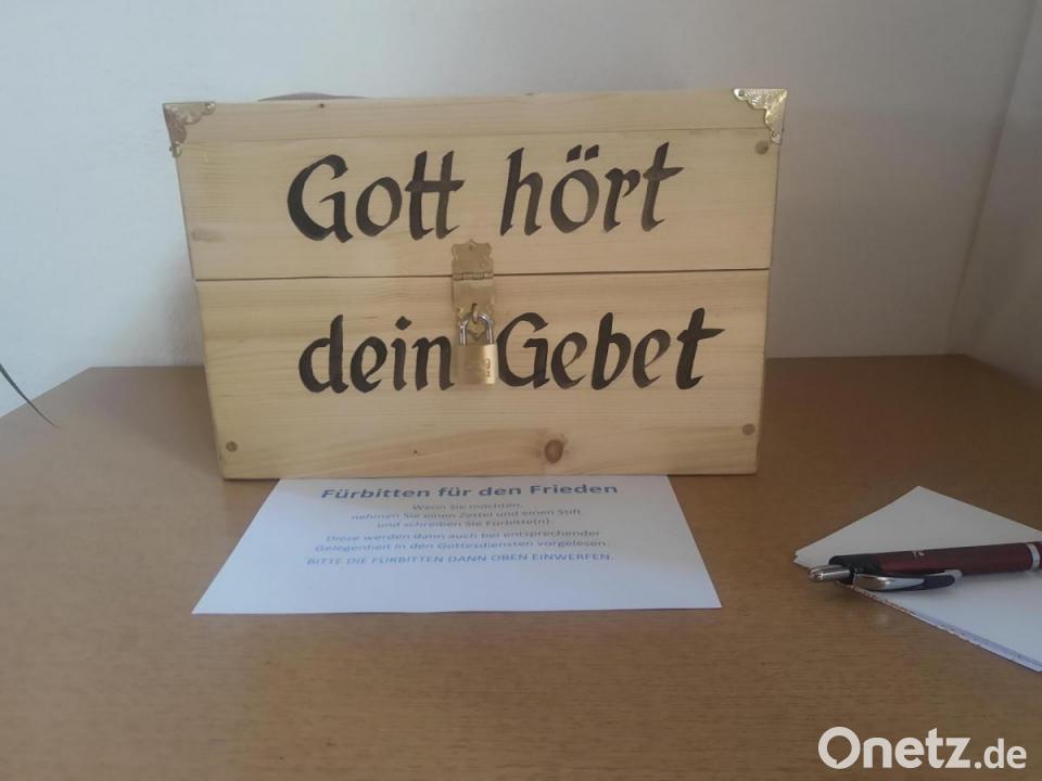 Die Gläubigen können ihre Anliegen auf Zetteln formulieren und in die Box werfen. Nicht nur für Fürbitten für die Ukraine, auch für eigene Anliegen ist diese Einrichtung vorgesehen. Von Zeit zu Zeit wird der Kasten geöffnet und die Zettel werden entnommen, um sie in die Fürbitten beim Gottesdienst einzubauen. In vielen Kirchen liegen Fürbitten-Bücher auf und viele sind oft ganz schnell gefüllt und müssen erneuert werden.
