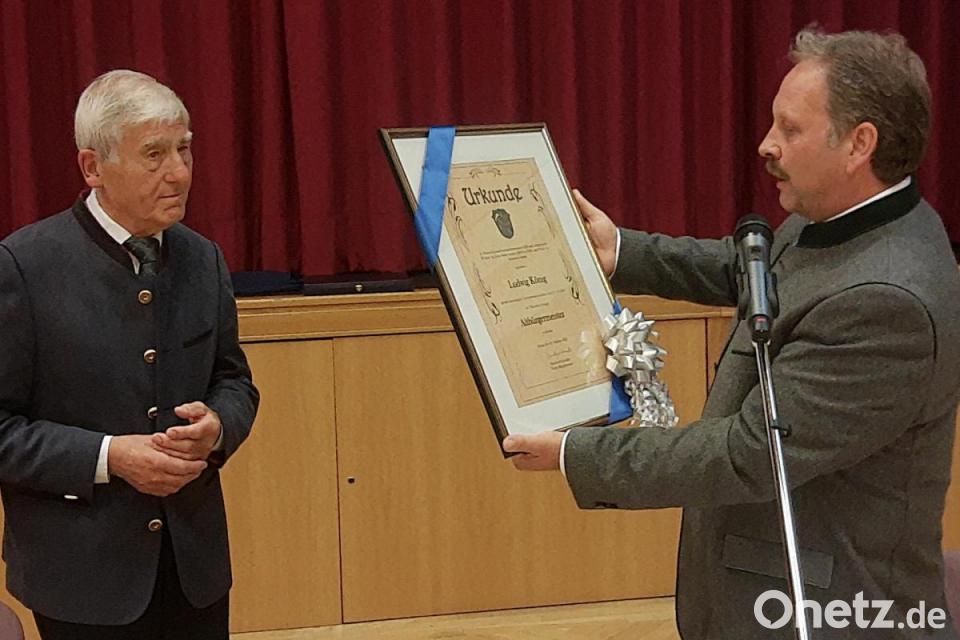 Die Eröffnung des Schlachthauses wird nun ein klein wenig feierlicher. Der Tatsache, dass Ludwig König der Ehrentitel „Altbürgermeister“ verliehen wurde, verdankt die Gemeinde eine neue Amtskette, die Bürgermeister Bernhard Schindler bei der Eröffnung sicher tragen wird. Ludwig König überreichte sie ihm bei als Abschiedsgeschenk in der Festsitzung im Mehrzwecksaal. Es zähle zu den ehrenvollen Aufgaben eines Bürgermeisters, den Titel des Altbürgermeisters verleihen zu dürfen, sagte Bernhard Schindler zu Beginn des Abends. Er freue sich sehr, dass der Gemeinderat im Juli einstimmig die Verleihung des Titels beschlossen hat.
