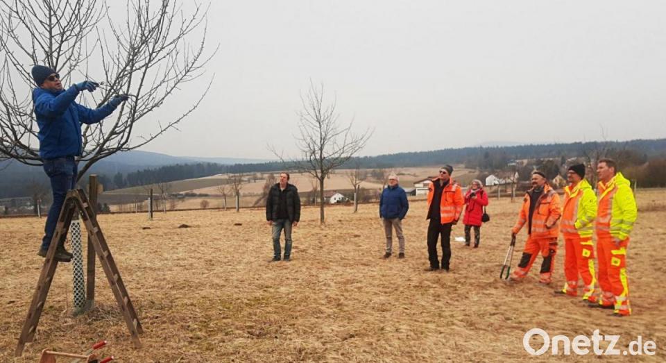 Orange Signalfarben in größerer Anzahl, dazu Kommunalfahrzeuge und Kleintransporter am Sportplatz an der Jahnstraße in Brand: An der Geburtenobstwiese waren Bauhofmitarbeiter zusammengekommen, mittendrin Kreisgartenfachberater Harald Schlöger. Die Steinwald-Allianz hatte zum Obstbaum-Schnittkurs geladen, knapp 20 Bauhofmitarbeiter zeigten Interesse.