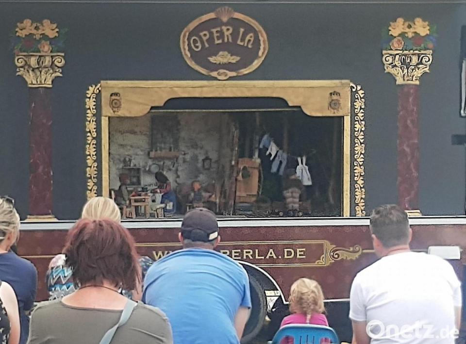 Das mobile „Operla“ gastierte auf dem Goetz-Areal in Brand, lockte über 60 Besucher an - in der Überzahl Erwachsene. Dass die Aufführung im „Stodl“ nicht klappte, weil der Winkel der Einfahrt es nicht zuließ, das mobile Theater hineinzuschieben, sollte sich als günstiger Umstand herausstellen: Schnell war ein schöner Platz daneben gefunden, waren Bänke und Tische aufgestellt, um allen großen und kleinen Besuchern möglichst optimale Sicht auf die kleine Bühne seitlich eines umgebauten Imbisswagens zu ermöglichen. Dort öffnete sich dann auch bald der Vorhang für eine Kurzfassung von Engelbert Humperdincks Märchenoper „Hänsel und Gretel“.