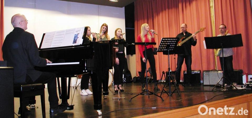Aufwendige Technik, deren Installation ihre Zeit braucht, mag ein äußeres Zeichen dieser „anderen Musikschule“ sein. Stellvertretende Leiterin Carol Bischoff begrüßte die jungen Künstler und die Gäste, um dann ein Programm ablaufen zu lassen, dass vier Mädchen mit klaren und hellen Stimmen bestritten, begleitet von einer Lehrer-Combo, und der Kammerchor der Musikschule unter der Leitung von Helmut Burkhardt, der auch den Klavierpart zu vielen Punkten des Programms übernommen hatte. Kräftig und frisch bewiesen die Gesangsschülerinnen von Carol Bischoff, Lea Dietl, Jennifer Bäumler, Eva-Maria Linkel und Sandra Schreyer mit „Rolling in The Deep“ im Einstieg ihr Können. Durchgehend englischsprachige Titel wurden von den vier Mädchen interpretiert. Jennifer Bäumler und Lea Dietl hatten darüber hinaus Gelegenheit, von der Combo begleitet, solistisch aufzutreten und von Bassist Uli Schmutzer eigens geschriebene Arrangements zu Gehör zu bringen. Mit ihren klaren Stimmen, leichtes Vibrato beinhaltend, wurden die Darbietungen mit reichem Applaus bedacht.