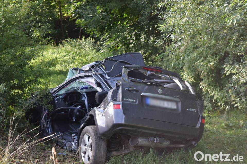 Der Suzuki überschlug sich daraufhin und schlitterte auf dem Dach liegend über die Fahrbahn. Nach circa 50 Metern prallte der Suzuki gegen einen Baum im Straßengraben und wurde wieder zurück auf die Räder geschleudert. Der Fahrer wurde dabei schwer verletzt und im Wagen eingeklemmt.