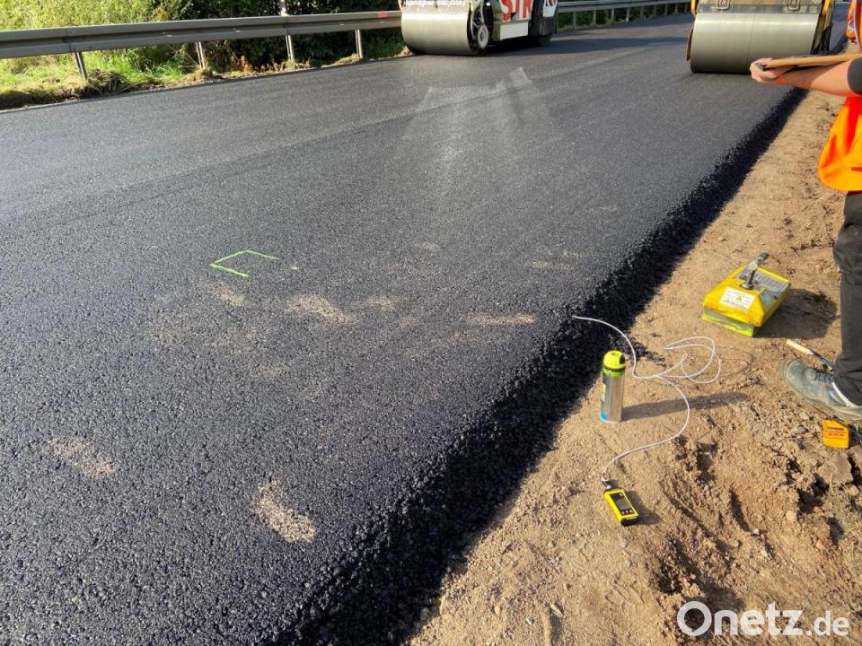 Herkömmlicher Asphalt wird in der Regel mit einer Temperatur von 160 bis 180 Grad verbaut. Messungen auf der Teststrecke haben Einbautemperaturen von 140 bis 150 Grad ergeben. Die Firma Strabag führte die Messungen mittels Thermoscan und einer umfangreichen Dokumentation durch. Um die notwendige Verdichtung des aufgebrachten Asphalts zu testen, wird eine sogenannte flächendeckende Verdichtungskontrolle (FDK) vorgenommen. Weiterhin wird während dem Verdichtungsvorgang mit Walzen die Kerntemperatur des bereits eingebauten Asphalts durch eingelegte Temperaturfühler kontrolliert. Hierdurch kann beurteilt werden, wie lange die Asphaltschichten verdichtet werden können, ohne Schaden zu nehmen. Das bereits am 18. und 19. September eingebaute Probefeld, in dem das vorgesehene Mischgut auf Einbau- und Verdichtbarkeit vorab geprüft wurde, wies bereits sehr gute Werte auf. In den kommenden Jahren sind dann auch Aussagen zur Dauerhaftigkeit, sprich Haltbarkeit der neuen Asphaltschichten möglich.