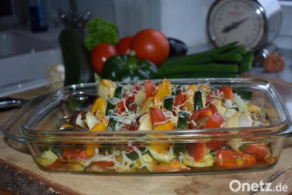 Die vorbereiteten Gemüsestücke abwechselnd auf Spießen stecken. Die Gemüsereste, falls vorhanden, ebenfalls in der Auflaufform verteilen.