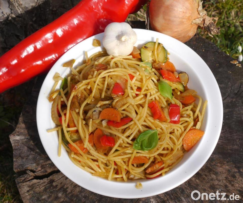 Zuerst Paprika, Zucchini und Karotten in etwas Olivenöl anbraten, anschließend den Fenchel die Champignons, die Zwiebel und zum Schluss den Knoblauch zugeben und mitbraten. In der Zwischenzeit die Spaghetti in drei Teile brechen und nach Packungsanweisung kochen, dann abgießen. Das Gemüse kräftig mit Salz, Pfeffer, Curry, etwas Chili, Ingwer, Paprikapulver, Sojasoße, Zucker und einem Spritzer Zitronensaft würzen. Danach die Nudeln zusammen mit etwas Olivenöl daruntermischen und kurz mitbraten. Frisches Basilikum dazugeben. (dt)