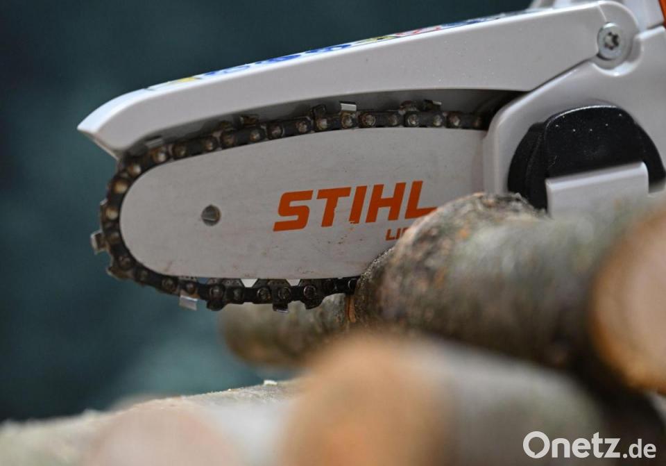 - eine orange Motorsäge der Marke Stihl, Typ MS400c