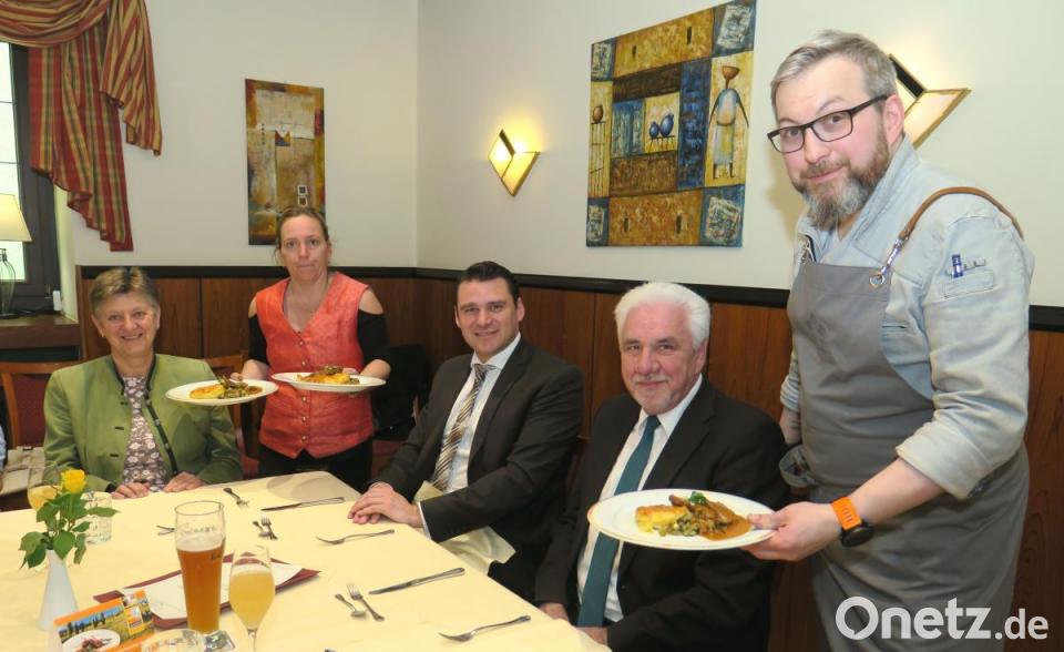 Im Landkreis haben sich sechs Gastwirte, drei Metzgereien, ein Schlacht- und Zerlegebetrieb sowie ein Hofladen der Vermarktung der Juradistl-Produkte verschrieben. "Damit bleiben mit der Marke betriebliche Wertschöpfung und Kaufkraft in der Region", stellte der Landrat fest. Zu den Gasthäusern der ersten Stunde gehört der "Gasthof zu den 3 Kronen" in Burglengenfeld. Inhaber Josef Augustin empfiehlt als Vorspeise ein Lammragout mit Kartoffelbrei und Fenchel und als Hauptgericht Lammbraten mit Gemüse, Chorizo und Auflaufkartoffeln. Das Menü genossen neben dem Landrat auch die Bürgermeisterin von Teublitz, Maria Steger, und der dritte Bürgermeister von Burglengenfeld, Josef Gruber.