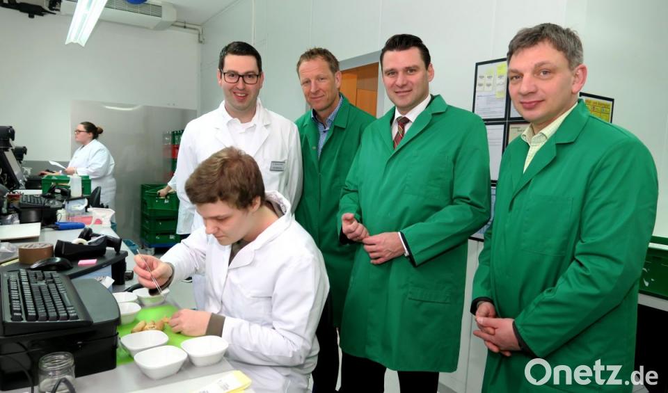 "Unser Labor platzt trotz mehrmaliger Erweiterung aus allen Nähten", erklärt Dr. Andreas Kneißler dem Landrat, der in Begleitung seiner Mitarbeiters Christian Meyer und des IHK-Geschäftsführers Manuel Lischka gekommen war. Das rasche Wachstum des Unternehmens erfordere einen Neubau mit veranschlagten Kosten von acht Millionen Euro.