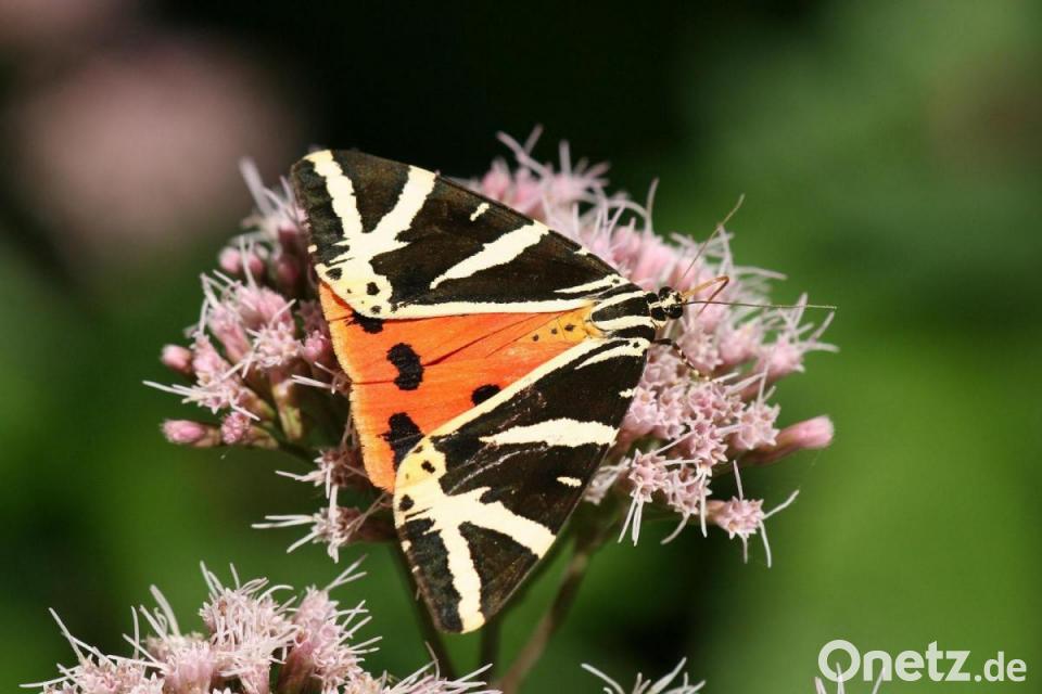 Hört sich an wie eine Geschichte aus dem Sommerloch, ist aber wahr: In diesen Wochen ist der Russische Bär, auch Spanische Flagge genannt, im Staatswald des Forstbetriebs Burglengenfeld zu beobachten. Der sehr farbenprächtige, recht seltene Schmetterling gehört zur Familie der Bärenspinner und erreicht eine Flügelspannweite von etwa fünf Zentimetern. Seine Vorderflügel sind schwarzblau mit weißgelben Streifen gemustert, die Hinterflügel auffällig leuchtend orangerot und mit einigen dunklen Flecken gezeichnet. Die Schmetterlinge treten von Juli bis September auf und saugen fast ausschließlich an den violetten Blüten des gewöhnlichen Wasserdosts, einer hoch wachsenden Staude, die an feuchten Wald- und Wegrändern vorkommt. Nach der Paarung und Eiablage schlüpfen im September die nachtaktiven Raupen und fressen bis zur Überwinterung an unterschiedlichen Kräutern und Sträuchern. Nach der Winterruhe ernähren sich die Raupen von Sträuchern wie Brombeere und Haselnuss, verpuppen sich im Juni in einem weißgrauen Gespinst an der Erde und schließlich schlüpft im Juli die neue Faltergeneration.