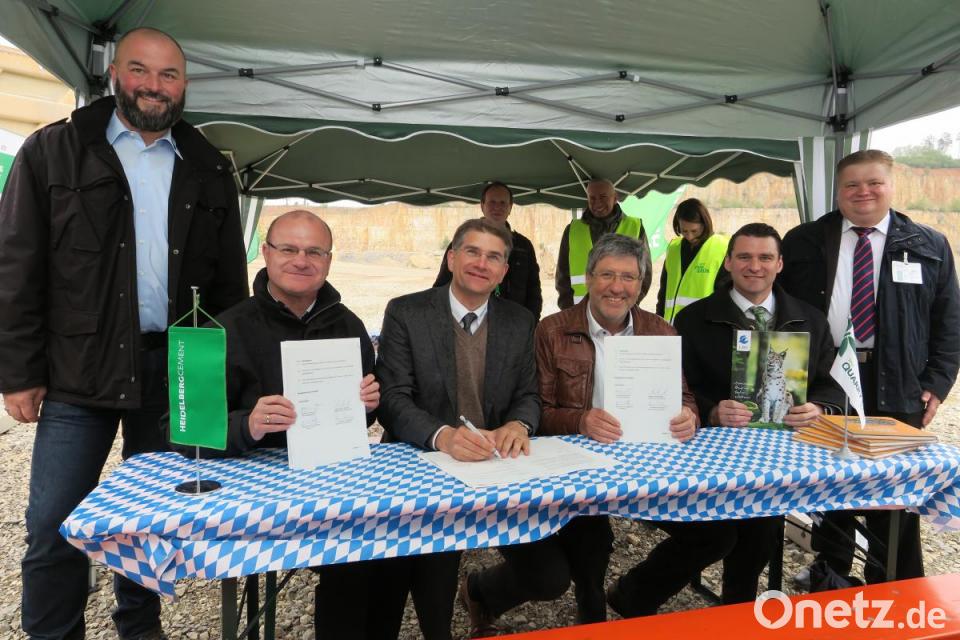 Bei einem Geländetermin im Steinbruch in Burglengenfeld haben am Montag LBV-Vorsitzender Norbert Schäffer, der Werkleiter der HeidelbergCement AG, Henrik Wesseling, Landrat Thomas Ebeling und der Leiter der Höheren Naturschutzbehörde bei der Regierung der Oberpfalz, Direktor Norbert Dirscherl, eine Kooperationsvereinbarung unterzeichnet.