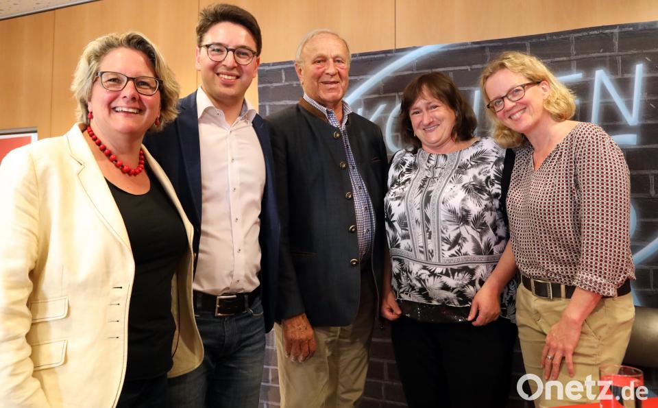SPD-Spitzenkandidatin Natascha Kohnen (rechts) lud sich zu einer Veranstaltung in der Burglengenfelder Stadthalle Umweltministerin Svenja Schulze (links) ein. Auch (ab Zweiter von links) Landtagskandidat Peter Wein, Alt-Landrat Hans Schuierer und Bundestagsabgeordnete Marianne Schieder kamen zu „Kohnen Plus“.