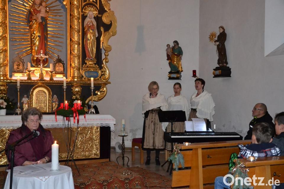 Auf eine besinnliche Stunde stimmte Tobias Voit am E-Piano in der Ortskirche Burgtreswitz die Besucher ein. Hans-Josef Völkl begrüßte im Namen des Fördervereins Schloss Burgtreswitz die Zuhörer im vollen Gotteshaus im Rahmen des Weihnachtsmarktes. “Nun es nahen sich die Stunden“ sang die Gruppe „Triangel“ aus Waldthurn unter Leitung von Hans-Josef Völkl am Piano. „Ich winsch enk das staad is, denn drass is zu laut und der Lärm dout so wei“, begann Sprecherin Helene Rolle mit einem Gedicht von E. Michler. Rolle hatte die Texte in Mundart verfasst. „Maria durch ein Dornwald ging, Kyrie eleison“ stimmten die Sängerinnen beeindruckend und mehrstimmig an. „S`Christkindl is weg“, für die einen ist es verloren, für die anderen hat man das Christkind im Wohlstand erstickt. Wer möchte, dass das Christkind wieder zurück kehren soll, der muss wieder Gott und den Himmel vertrauen.