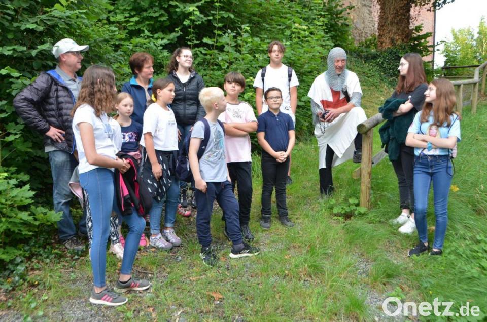 Doch auch die im Michlbachwald untergegangenen Ortschaften Michlbach und Aiglersreuth wurden bei den Oberpfälzer Siedlungsgeschichten erwähnt. Große Augen machten die Teilnehmer als bei der Ankunft in Burgtreswitz „Pernoldus von Draeswitz“, der erste bekannte Ritter, in einer rund 30 Kilogramm schweren Kettenrüstung zum Burggraben herabstieg und die Gäste mit Schwert und Morgenstern empfing. Der Ritter wurde im Jahre 1218 erstmals erwähnt. Hans-Josef Völkl schlüpfte in diese Rolle und wusste viel über diese Vergangenheit der mittelalterlichen Burg zu berichten. Natürlich auch über das Schlossgespenst „Matere“, das hier sein Unwesen treiben soll. Nach so viel Geschichtsträchtigem kam die Wurstsemmel und ein Getränk für jeden Teilnehmer gerade recht.