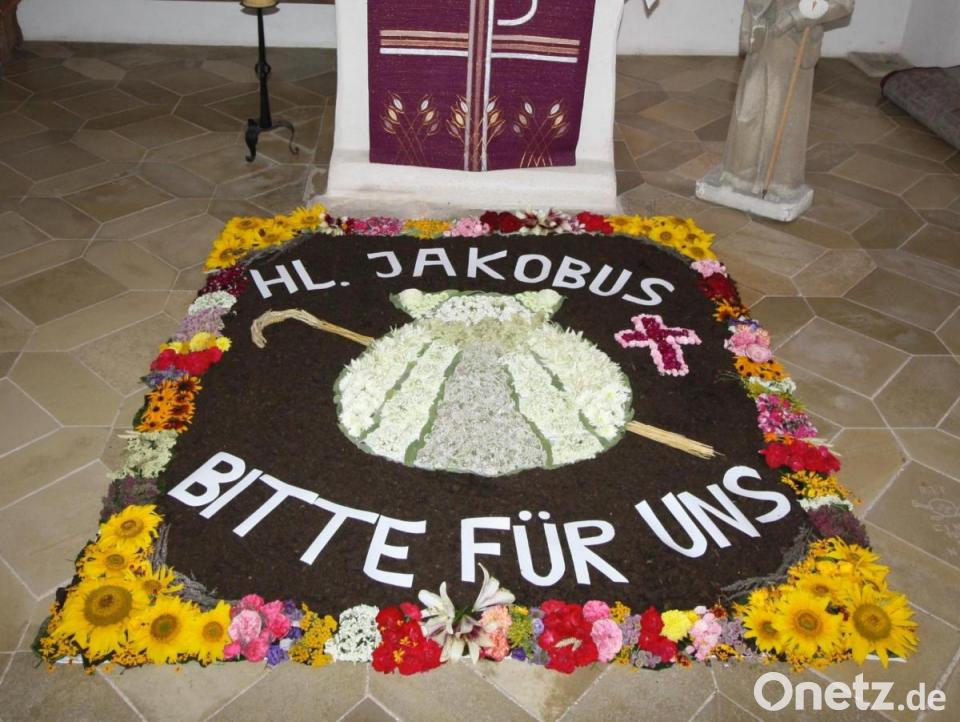 Um nun auch in Burkhardsreuth symbolisch ein kleines „Santiago“ aufblühen zu lassen, hatten sich für 9.30 Uhr am Sonntagmorgen acht Mitglieder der Landjugendgruppe zum „Blütenpuzzle-Legen“ in der Turmkapelle verabredet. In konzentrierter und liebevoller Arbeit entstand so ein Kunstwerk, das die Fürsprache des Jüngers bei Gott für Pfarrei und Gemeinde erbittet und in dessen Mittelpunkt Muschel und Pilgerstab als Attribute des Heiligen stehen.