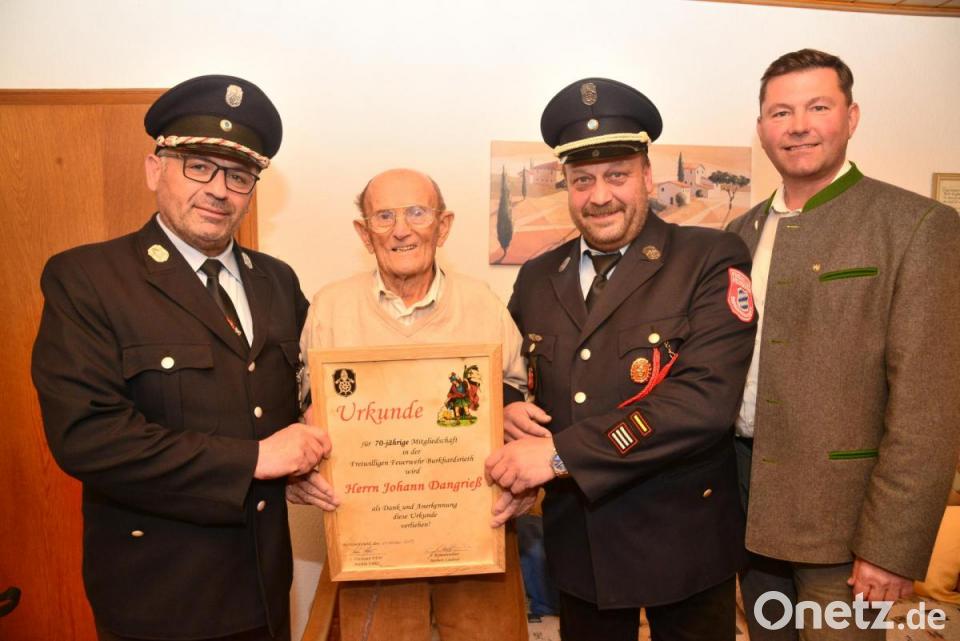 Eine nicht alltägliche Verbundenheit zur Feuerwehr Burkhardsrieth würdigten Vorsitzender Martin Völkl und Kommandant Herbert Lindner am Freitagabend. Johann Dangrieß wurde für 70-jährige Mitgliedschaft bei der Wehr mit einer Ehrenurkunde ausgezeichnet. Völkl erinnert bei der kleinen Feier im Haus des treuen Mitglieds an den Eintritt in die Burkhardsriether Wehr im Jahr 1949. Später ab dem Jahr 1971 war Johann Dangrieß für zwei Wahlperioden auch Mitglied der Vorstandschaft.