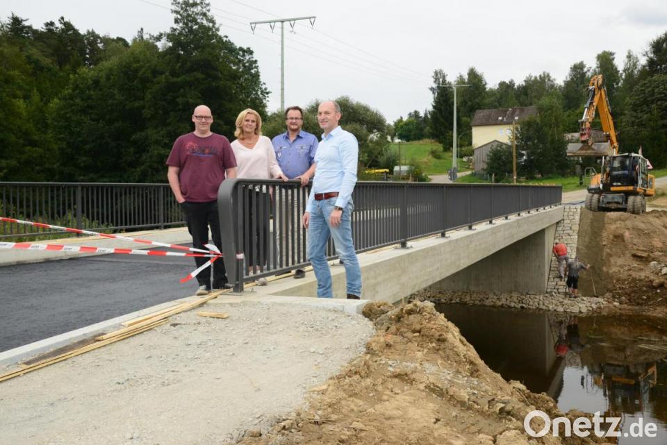 Zweite Bürgermeisterin Andrea Lang (Zweite von links) freut sich über den problemlosen Bau der Brücke über die Pfreimd bei Burkhardsrieth und findet dafür auch dankende Worte für das Ingenieurbüro Martin Kohl, Weiden, mit seinem Chef Martin Kohl (Zweiter von rechts). Sozusagen beim vorletzten Termin, dem noch ein offizielles Brückenfest folgt, mit dabei auch Geschäftsleiter Günter Gschwindler (rechts) und Markus Friedl (links).