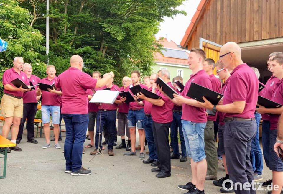 Die 29 Sänger boten in den feschen weinroten Einheits-T-Shirts unter der sicheren Stabsführung ihres Dirigenten Alexander Völkl in zwei Blöcken einen einstündigen Querschnitt durch ihr breit gefächertes Repertoire von Wander-, Trink- und Heimatliedern. Zum Einstieg in das Programm nach Noten ließ der Chor zügig den Vorspruch „Wohlan, ihr Freunde“ von Waldemar Klink erschallen. Es folgten unter anderem in flotter Weise „Hab' Sonne im Herzen“ sowie "Lustig ihr Brüder", und passend zur Ortschaft hoch über der Pfreimd das innig gesungene Werk „Friedlich am Wege ein Dörflein grüsst“ von Felix Glessmer.