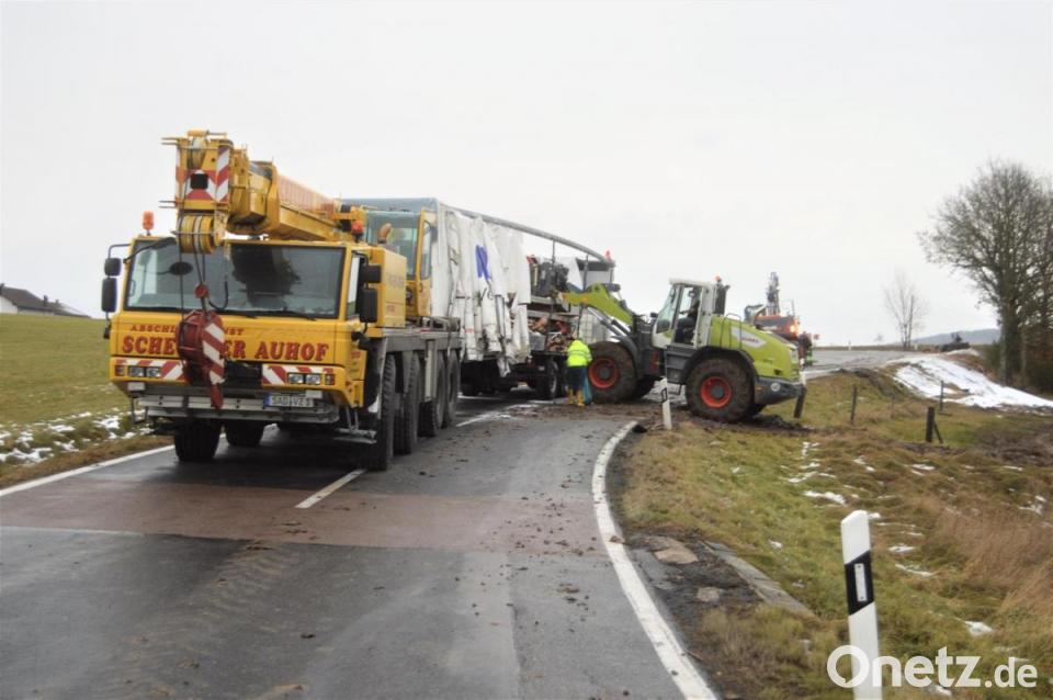 Eine Spezialfirma übernahm am Mittwoch die Bergung von Ladung und Anhänger. Während die Schäden am Sattelzug nicht so gravierend sind, ist die Ladung im Wert von gut 65.000 Euro wohl nicht mehr zu gebrauchen, heißt es im Polizeibericht. Nachdem Diesel ausgelaufen war, kamen auch Wasserwirtschaftsamt und Kreiswerke zum Ort des Geschehens, um mögliche Umweltschäden festzustellen. Wegen ausgelaufenen Treibstoffs muss allerdings Erdreich ausgetauscht werden, so die Polizei. Am Dienstagnachmittag passierte der Unfall. Dabei touchierte das Lastwagengespann einen Telefonmast und den Postkasten eines Anwohners. Drei Bäume mähte er um, kippte schließlich und blieb an der Böschung liegen. Der Fahrer zog sich Verletzungen zu.