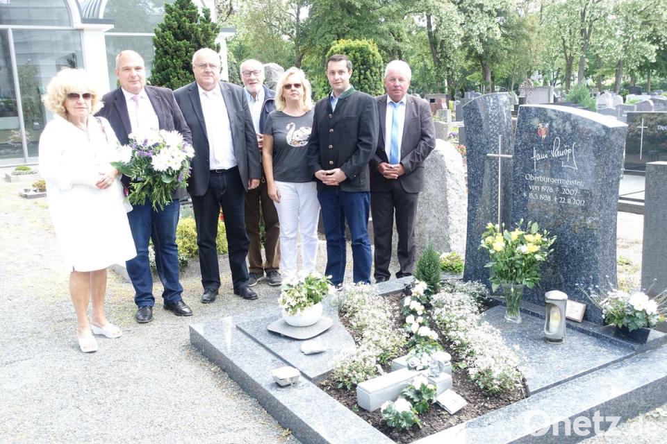 "Unsere Stadt hat Hans Schröpf viel zu verdanken", betonen Stephan Gollwitzer, Wolfgang Pausch und Lothar Höher am Grab von Hans Schröpf, der am 15. Mai 80 Jahre alt geworden wäre. Inge Schröpf kam ganz in Weiß zur Gedenkstunde: "Weiß war immer seine Lieblingsfarbe." Hans Schröpf starb am 22. November 2012. Bild: Wieder