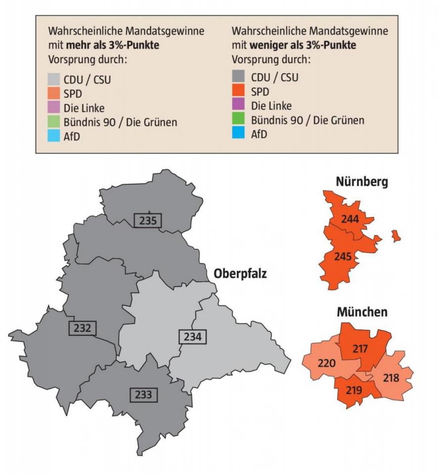 In den anderen Wahlkreisen der Oberpfalz sieht es dagegen besser für die CSU aus: Im Wahlkreis Weiden liegt Albert Rupprecht (CSU) klarer vor dem SPD-Kandidaten Uli Grötsch. In Amberg liegt Susanne Hierl aus dem Landkreis Neumarkt vor SPD-Kandidat Johannes Foitzik, der ebenfalls aus Neumarkt stammt. Im Wahlkreis Regensburg sieht die INSA-Prognose ebenfalls den amtierenden Wahlkreisabgeordneten Peter Aumer (CSU) vor SPD-Kandidatin Carolin Wagner.